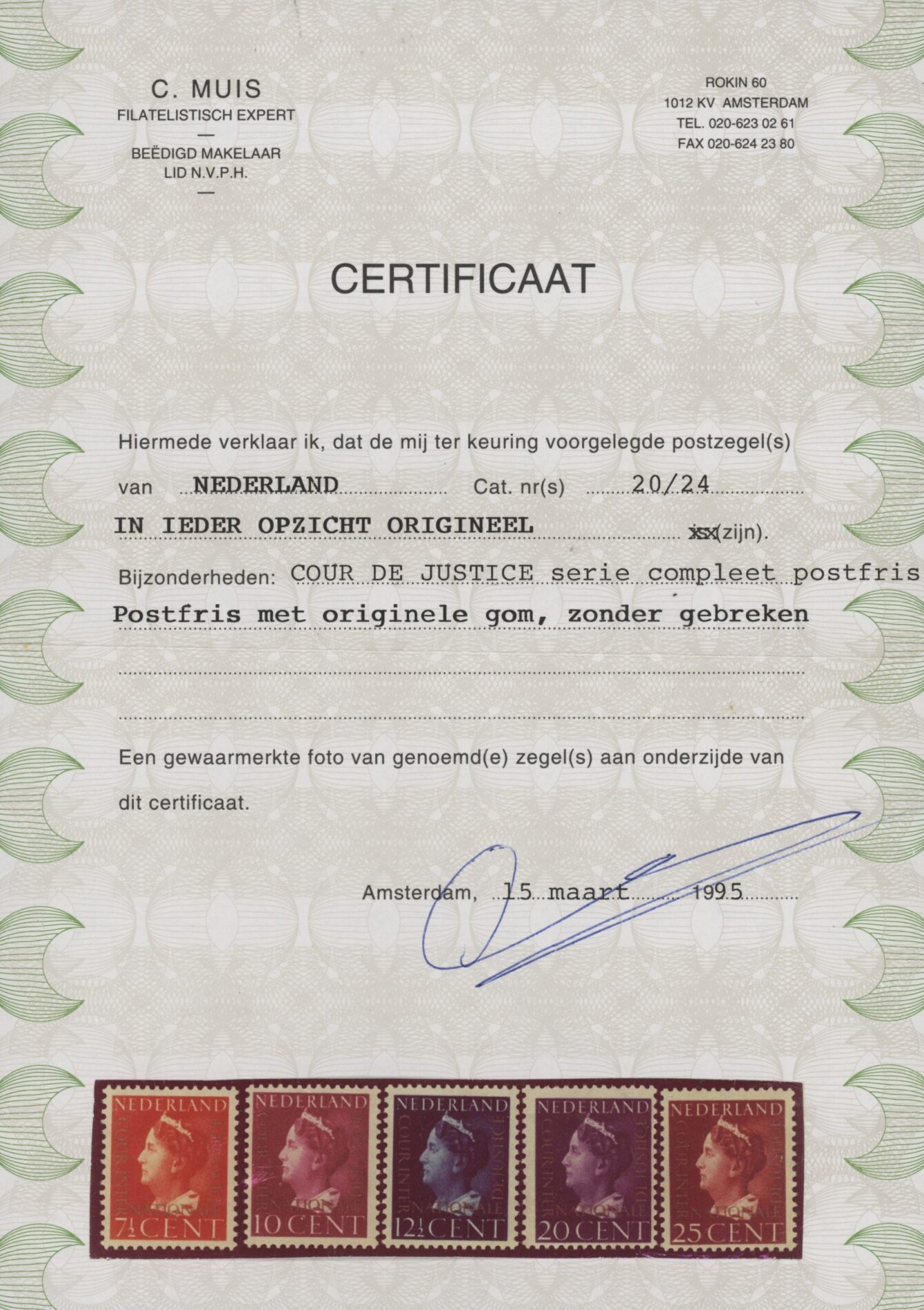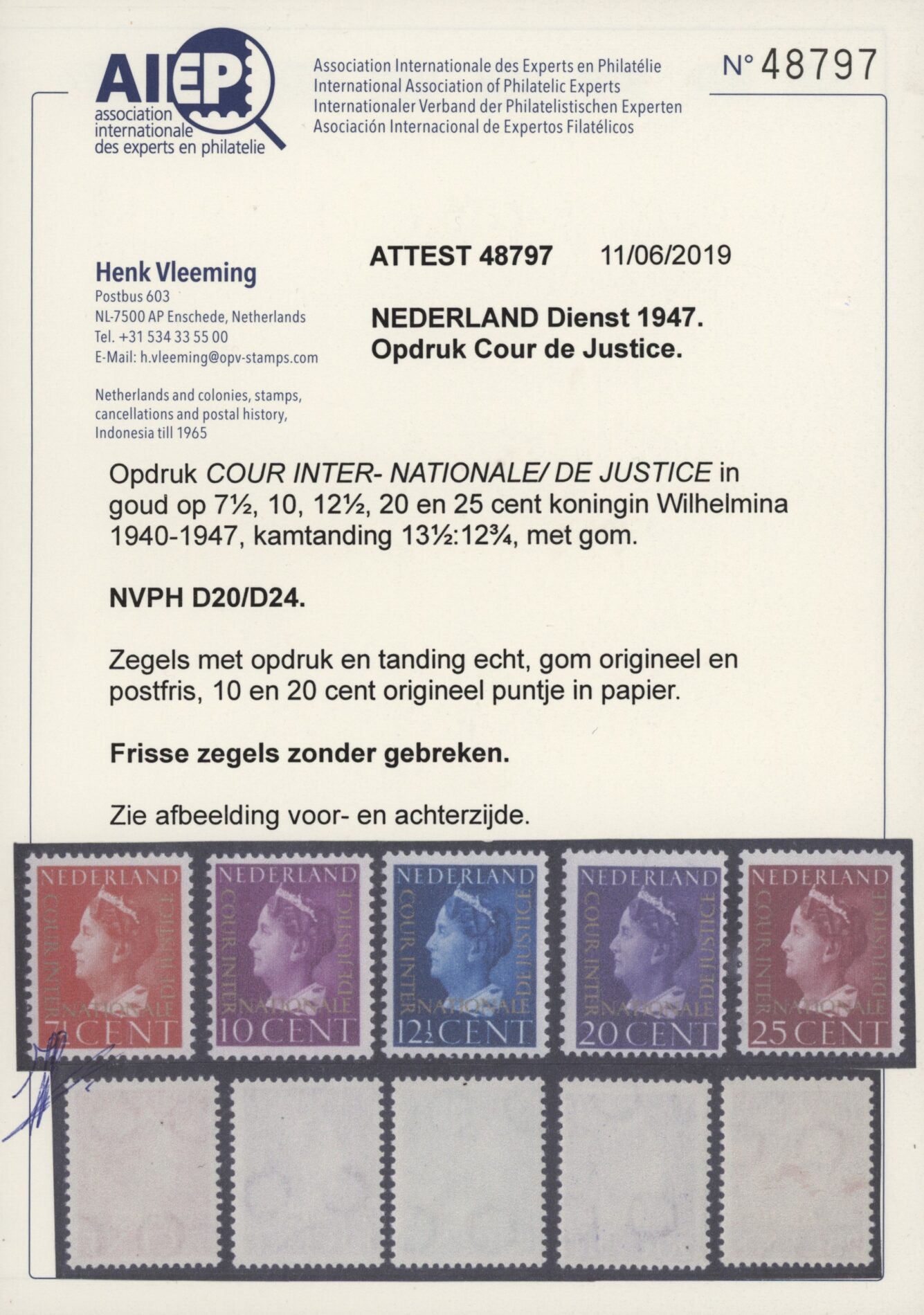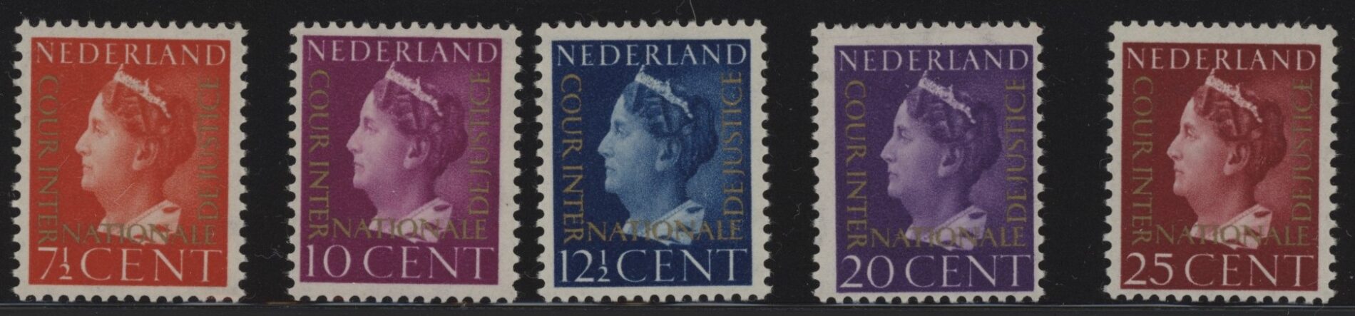 Nederland 1947, Dienstzegels Cour de Justice, opdruk Cour Internationale de Justice in goud op 7½, 10, 12½, 20 en 25 cent Koningin Wilhelmina, kamtanding 13½:12¾, NVPH nrs. D20-D24 postfris met originele gom. Een frisse complete serie zonder gebreken met certificaten Vleeming en Muis.