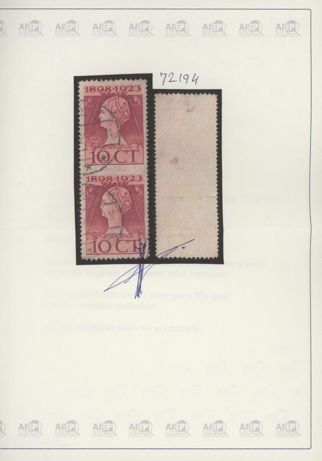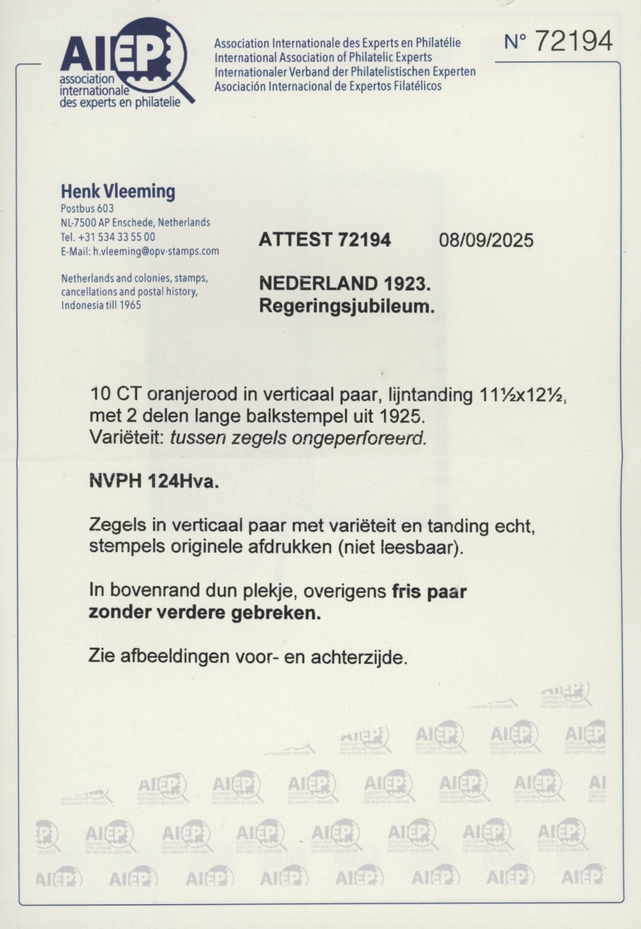 Nederland 1923, 1o cent oranjerood in verticaal paar, lijntanding 11 x12 , met twee delen lange balkstempel 1925, met variëteit tussen zegels ongeterforeerd, NVPH nr. 124Hva gestempeld. In de bovenrand een dun plekje maar overigens een fris paar zonder gebreken met certificaten Vleeming en NVPH.