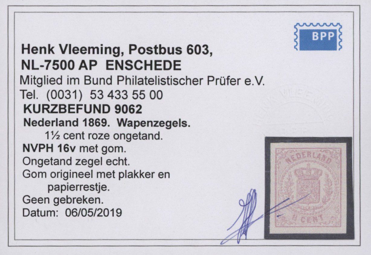 Nederland 1869-1871, 1½ cent roze, ongetand, NVPH nr. 16v (Wapenzegel) ongebruikt met originele gom. Een fris zegel zonder gebreken met kurzbefund Vleeming.