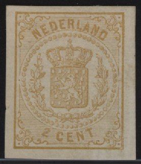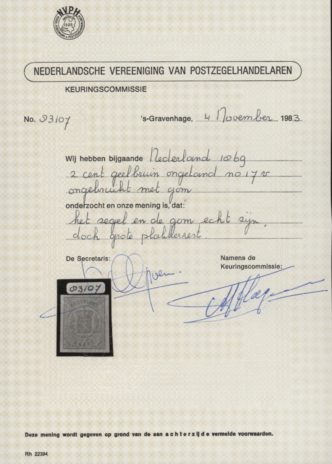 Nederland 1869-1871, 2 cent, bruingeel, ongetand, NVPH nr. 17v (Wapenzegel) ongebruikt met originele gom. Een fris zegel zonder gebreken maar met grote plakkerrest en NVPH certificaat.
