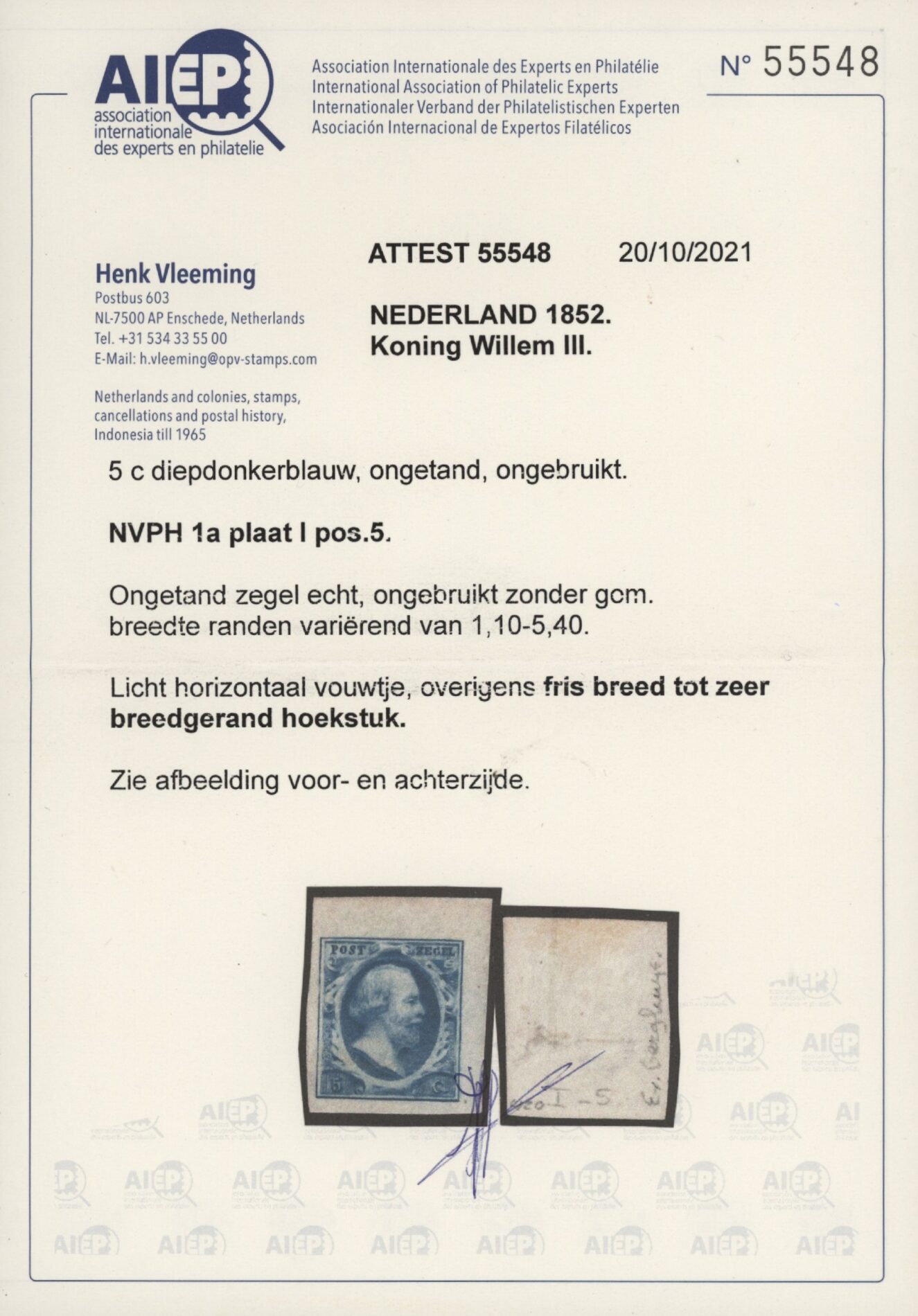 Nederland 1852, 5 cent diepdonkerblauw, NVPH 1a plaat I positie 5 (Koning Willem III) ongebruikt. De breedte van de randen varieert van 1,10-5,40 mm. Het zegel heeft een licht horizontaal vouwtje maar overigens een fris breed tot zeer breedgerand hoekstuk zonder gebreken met certificaat Vleeming.