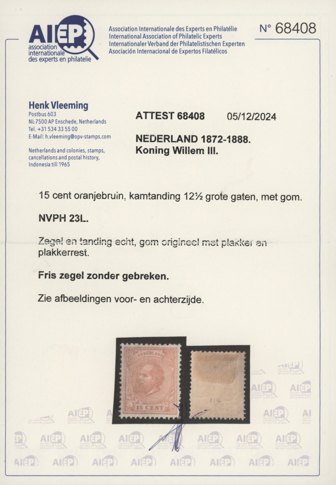 Nederland 1872-1888, 15 cent oranjebruin, kamtanding 12½, grote gaten, NVPH nr. 23L (Koning Willem III) met originele gom met plakker en plakkerresten. Een fris zegel zonder gebreken met certificaat Vleeming.