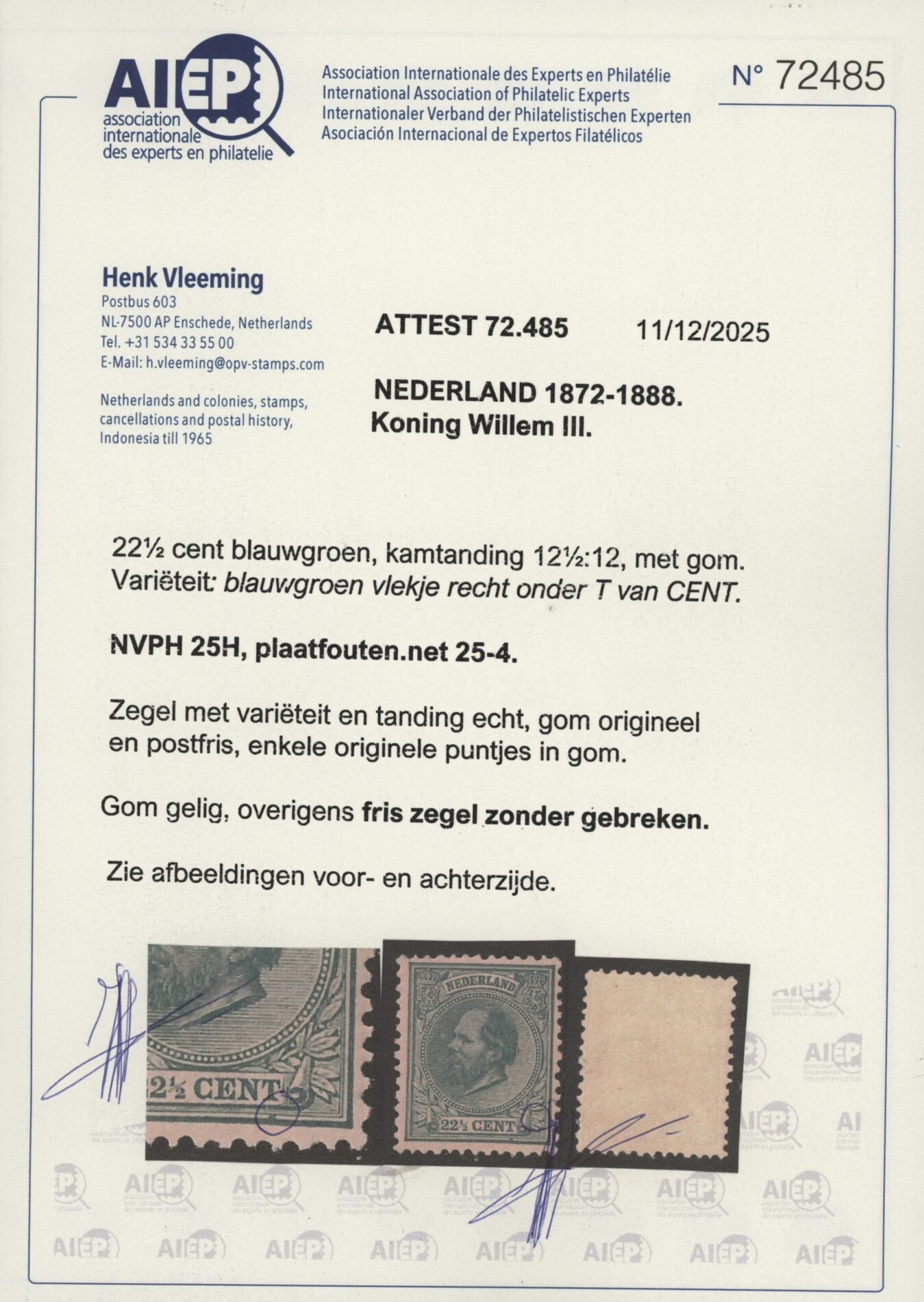 Nederland 1872-1888, 22½ cent blauwgroen, kamtanding 12½:12 met variëteit blauwgroen vlekje recht onder T van CENT, NVPH nr. 25H (Koning Willem III) postfris met originele gom. De gom is gelig overigens een fris zegel zonder gebreken met Vleeming certificaat.