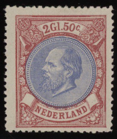 Nederland 1872-1888, 2½ gulden, rood en blauw, lijntanding 14 met kleine gaten, NVPH nr. 29A (Koning Willem III) postfris met originele gom met spoor verwijderde plakker en enkele originele zware puntjes in de gom. Een fris zegel in mooie kleuren met een certificaat Vleeming.