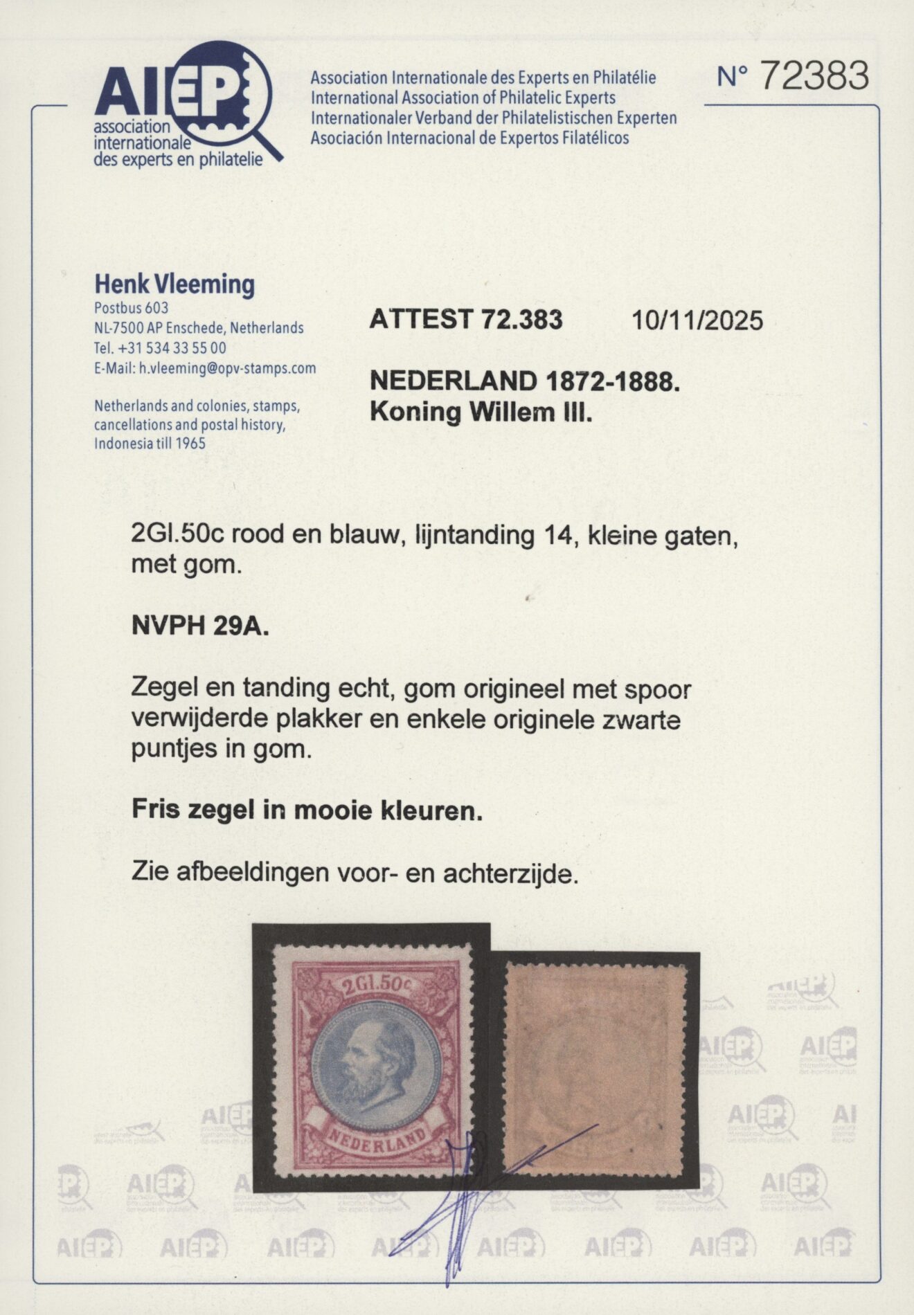 Frankeerzegel Nederland NVPH nr. 29A ongebruikt met certificaat Vleeming