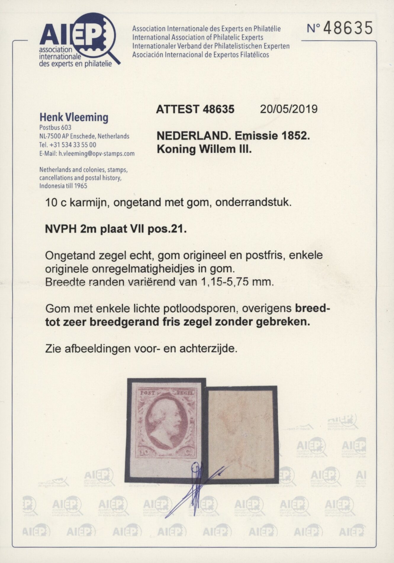 Nederland 1852, 10 cent karmijnroze, NVPH nr. 2m plaat VII positie 21 (Koning Willem III) postfris met originele gom. De breedte van de randen varieert van 1,15-5,75 mm. Op de gom enkele licht potloodsporen, overigens breed- tot zeer breedgerand fris zegel zonder gebreken met certificaat Vleeming.