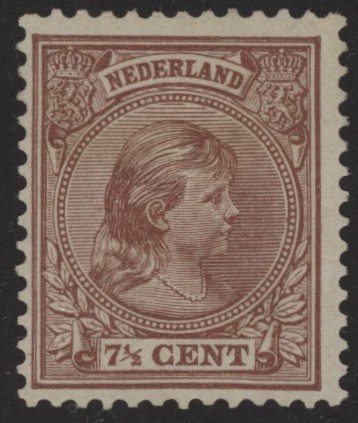 Nederland 1891-1894, 7½ cent bruin, kamtanding 12½, NVPH nr. 36 (Koningin Wilhelmina “hangend haar”) met originele gom. Een fris zegel zonder gebreken.