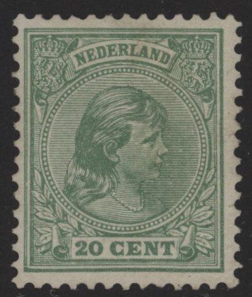 Nederland 1891-1894, 20 cent lichtgroen, NVPH nr. 40 (Koningin Wilhelmina “hangend haar”) met originele gom. Een fris zegel zonder gebreken.