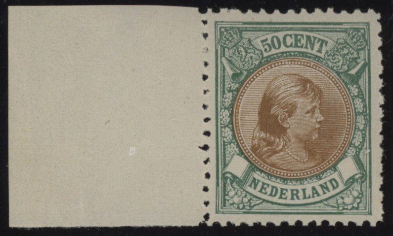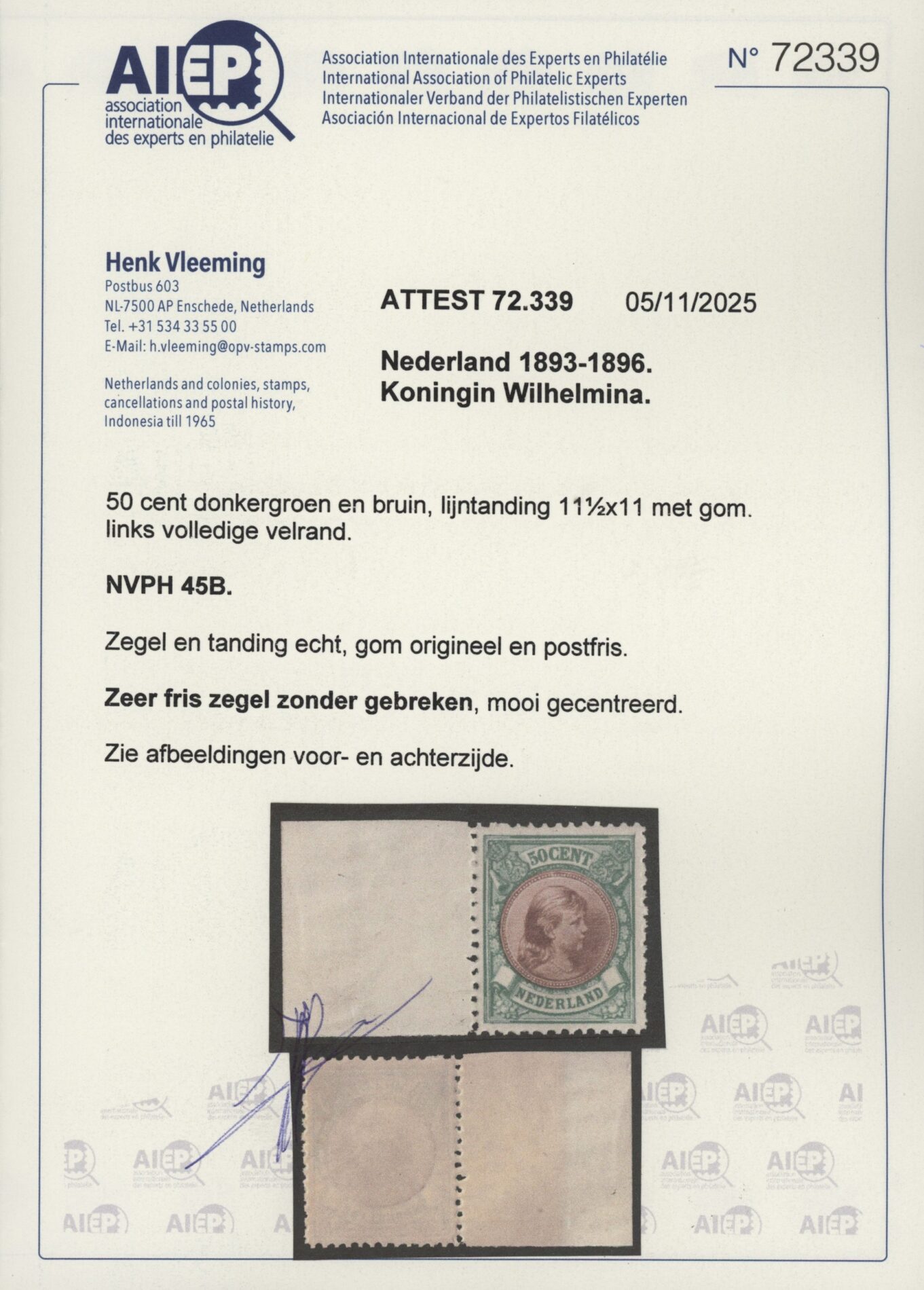 Nederland 1893-1896, 50 cent, donkergroen en bruin, lijntanding 11½x11, NVPH nr. 45B (Koningin Wilhelmina) postfris met originele gom. Een zeer fris zegel mooi gecentreerd zegel zonder gebreken met attest Vleeming attest. Het zegel heeft links een velrand.