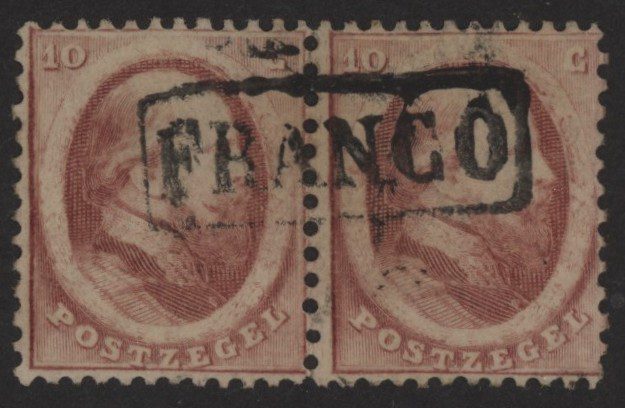 Nederland 1864, 10 cent donkerrood, NVPH nr. 5 (Koning Willem III) in paar gestempeld FRANCO in kastje. Een fris paar zonder gebreken.