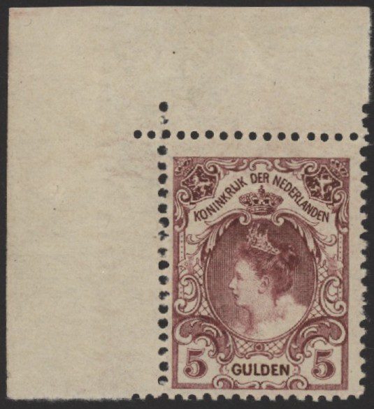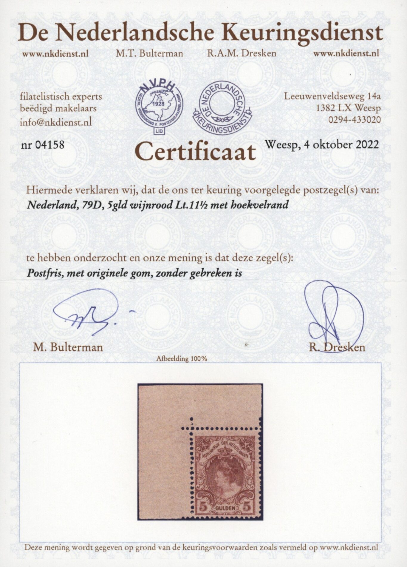 Nederland 1899-1905, 5 gulden wijnrood, lijntanding 11½, NVPH nr. 79D (Koningin Wilhelmina) met hoekvelrand linksboven, postfris met originele gom. Een fris zegel zonder gebreken met NKD certificaat.