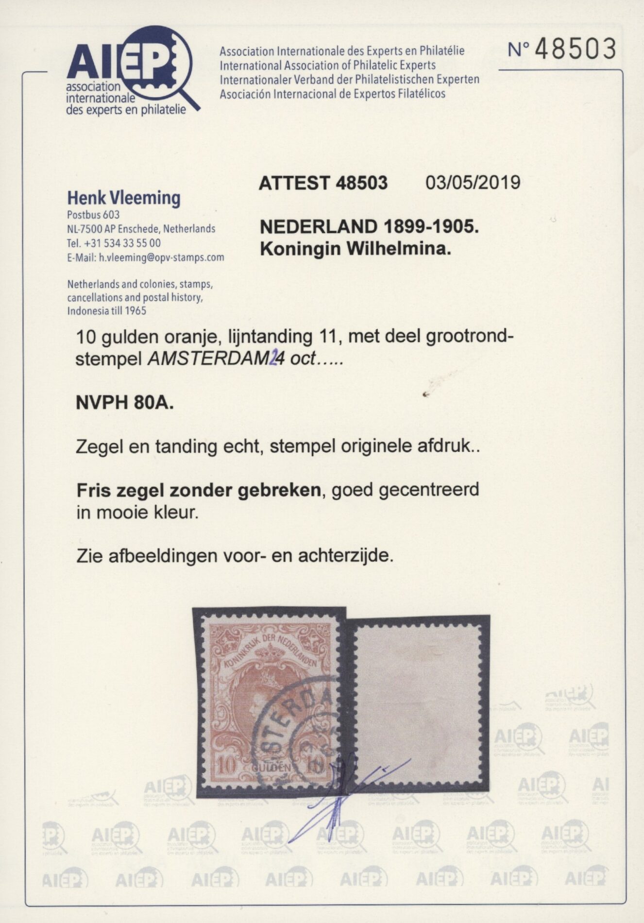 Nederland 1905, 10 gulden oranje, lijntanding 11, NVPH nr. 80A (Koningin Wilhelmina) gestempeld met deel grootrondstempel AMSTERDAM 24 oct…. Een fris zegel zonder gebreken, goed gecentreerd in mooie kleur.