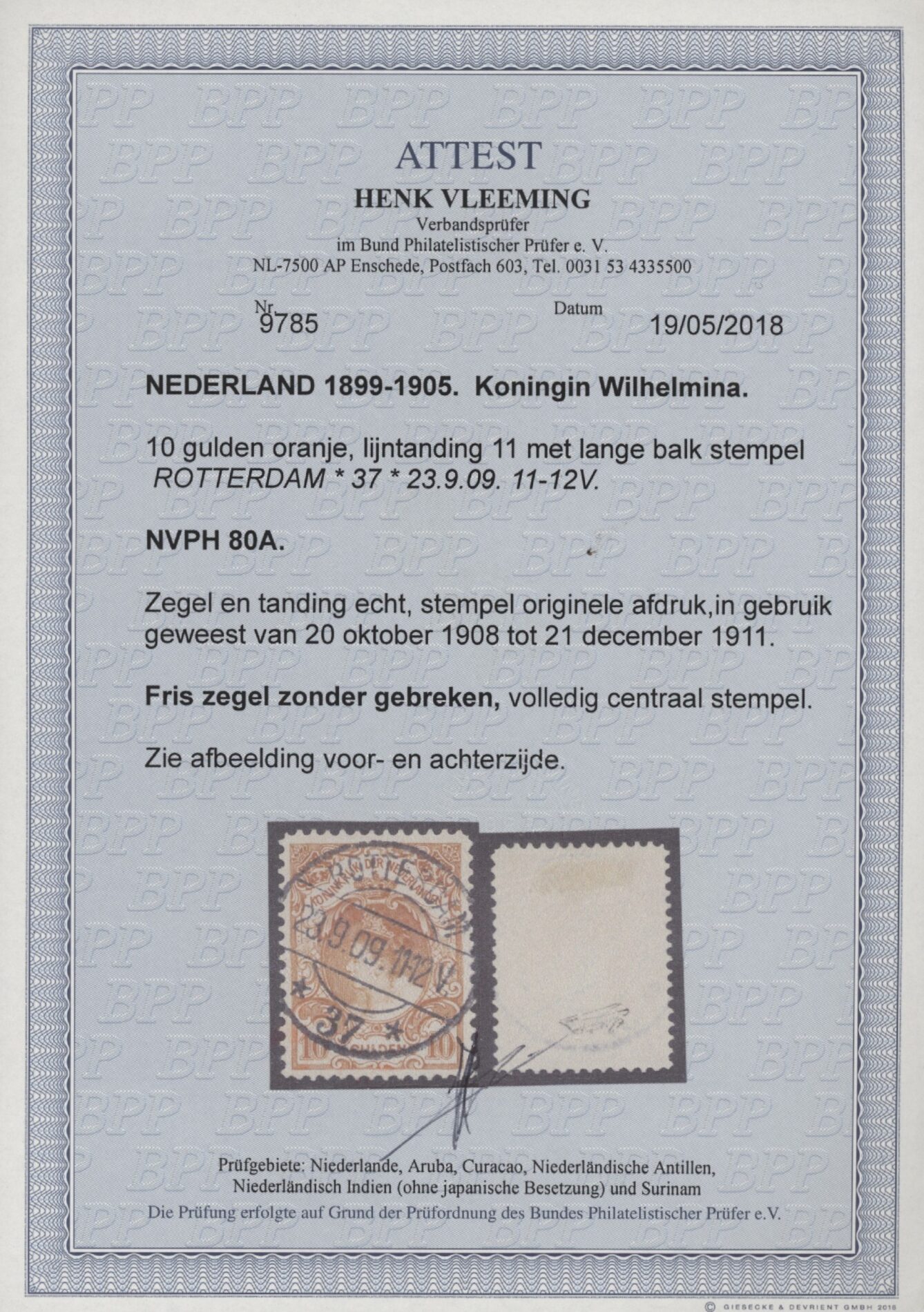 Nederland 1905, 10 gulden oranje, lijntanding 11, NVPH nr. 80A (Koningin Wilhelmina) gestempeld met lange balk stempel ROTTERDAM *37* 23.9.09. 11-12V Een fris zegel zonder gebreken met een volledig centraal stempel.