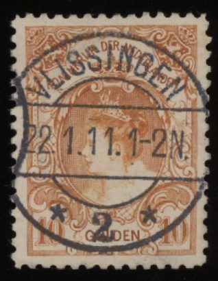 Nederland 1905, 10 gulden oranje, lijntanding 11, NVPH nr. 80A (Koningin Wilhelmina) gestempeld met een centraal lange balkstempel VLISSINGEN *2*22.1.11. 1-2N. Een fris zegel zonder gebreken met een volledig centraal stempel.