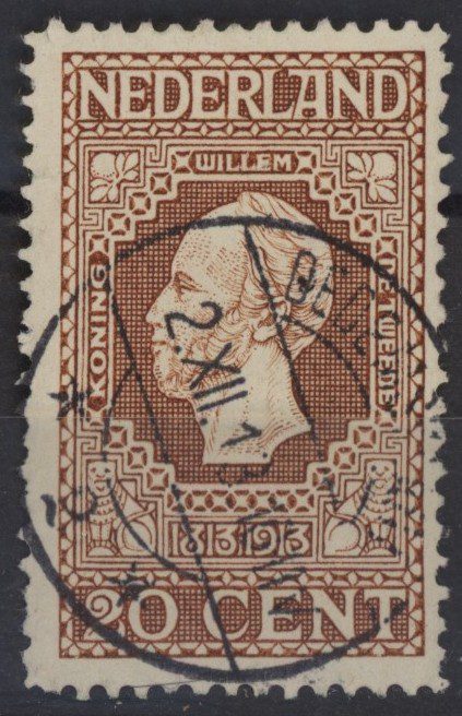 Nederland 1913, 20 cent, bruin, lijntanding 11½, NVPH nr. 95 (Koning Willem II) gestempeld. En fris zegel zonder gebreken.