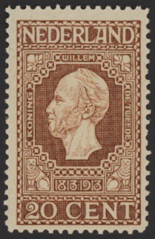 Nederland 1913, 20 cent, bruin, lijntanding 11½ x 11, NVPH nr. 95A (Koning Willem II) postfris met originele gom. Een fris zegel zonder gebreken.
