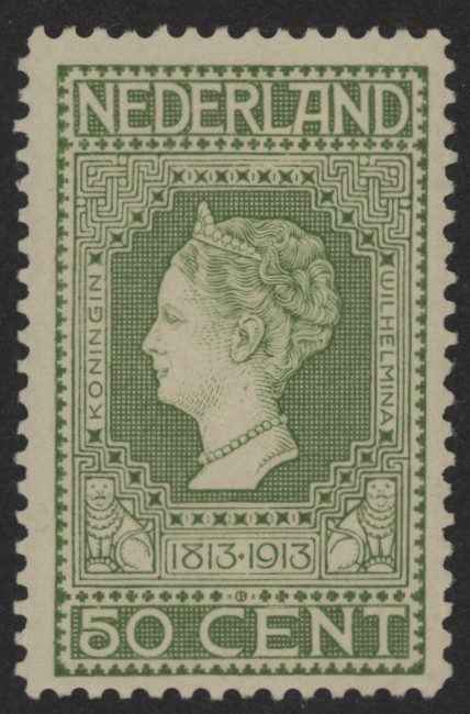 Nederland 1913, 50 cent lichtgeelgroen, NVPH nr. 97 (Koningin Wilhelmina) met originele gom. Een fris zegel zonder gebreken.