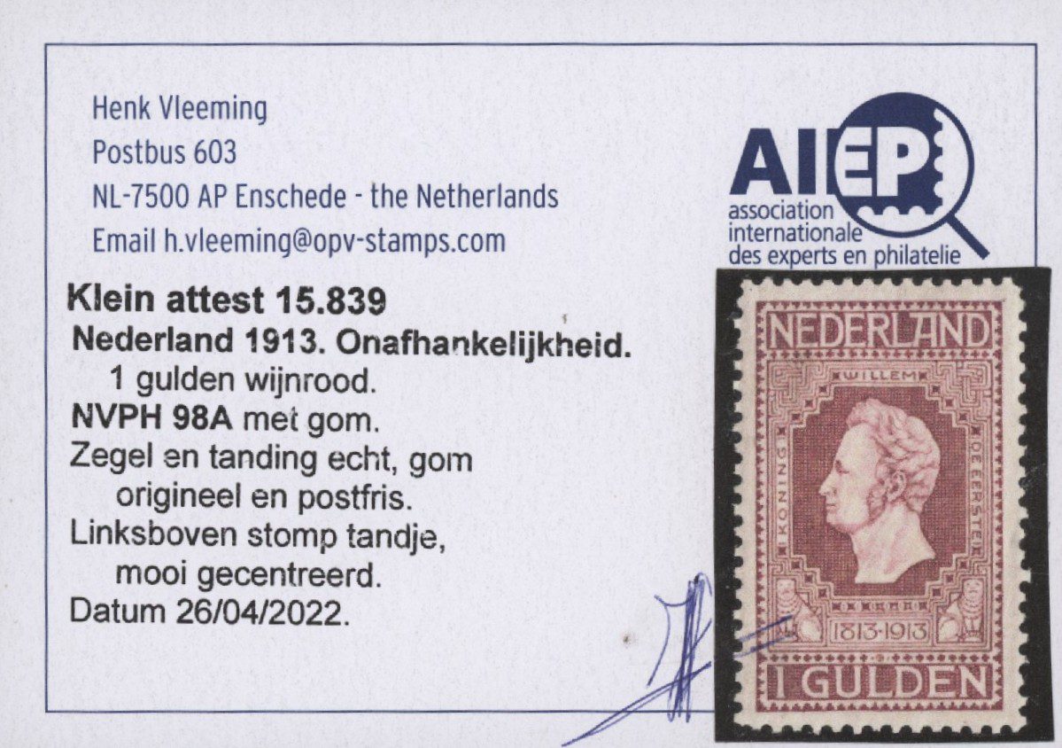 Nederland 1913, 1 gulden, wijnrood, lijntanding 11½ x11, NVPH nr. 98A (Koning Willem I) postfris met originele gom. Een fris mooi gecentreerd zegel zonder gebreken met Vleeming attest. Linksboven heeft het zegel een stomp tandje.