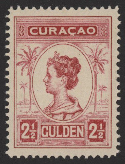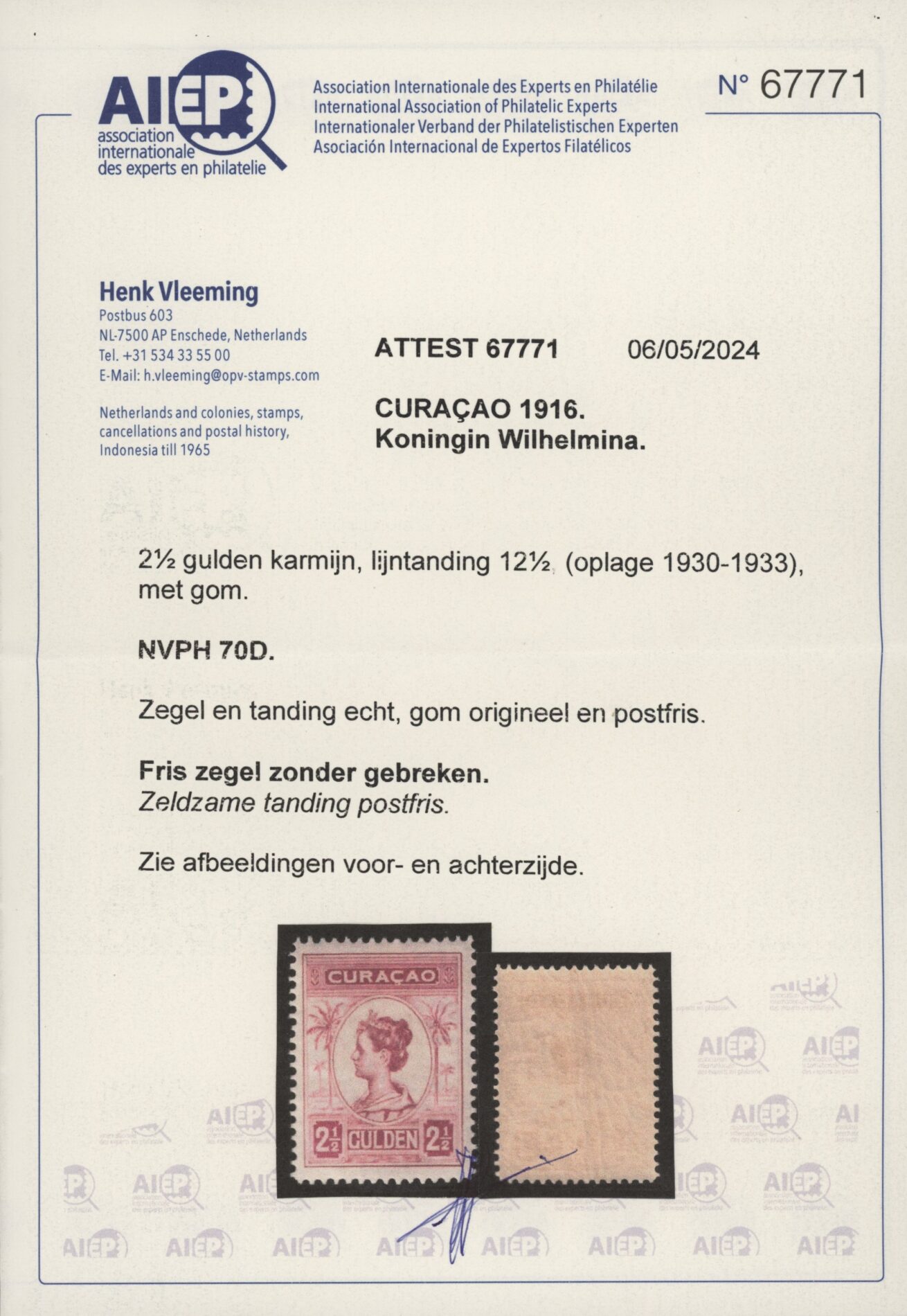 Curaçao frankeerzeges 1930-1933, 2½ gulden, karmijn, lijntanding 12½, NVPH nr. 70D (Koningin Wilhelmina) postfris met originele gom. Een fris zegel zonder gebreken met attest Vleeming. Postfris een zeldzame tanding postfris (zie attest Vleeming).