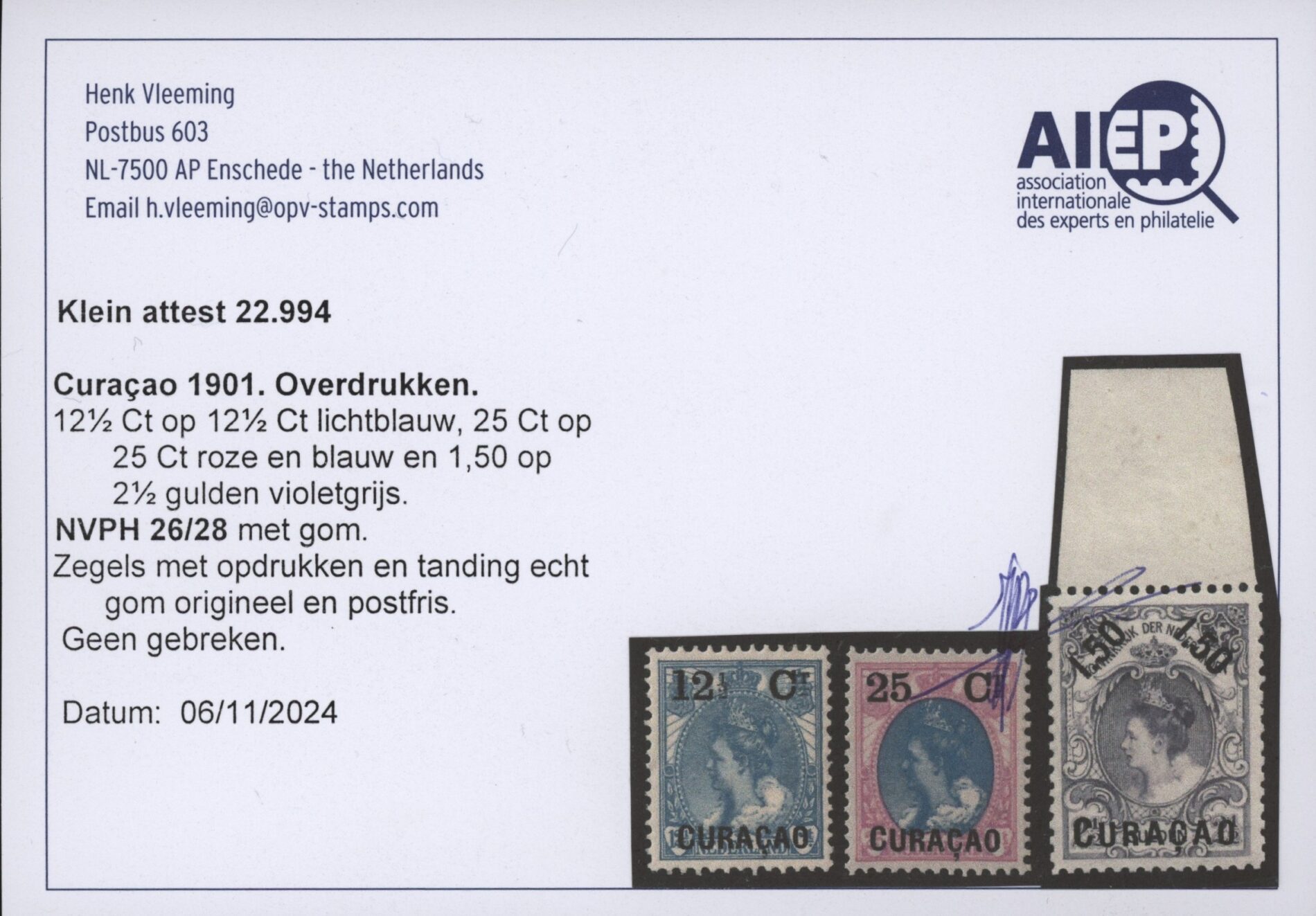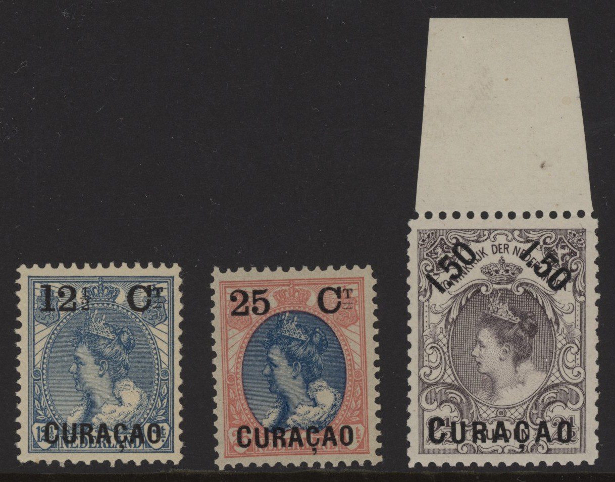 Curaçao 1901-1902, 12½ cent op 12½ cent blauw tot en met 1,50 gulden op 2,50 gulden violetgrijs, NVPH nrs. 26-28 (Frankeerzegels van Nederland van de uitgifte 1899 overdrukt in zwart) postfris met originele gom. De complete serie met frisse zegels zonder gebreken met attest Vleeming