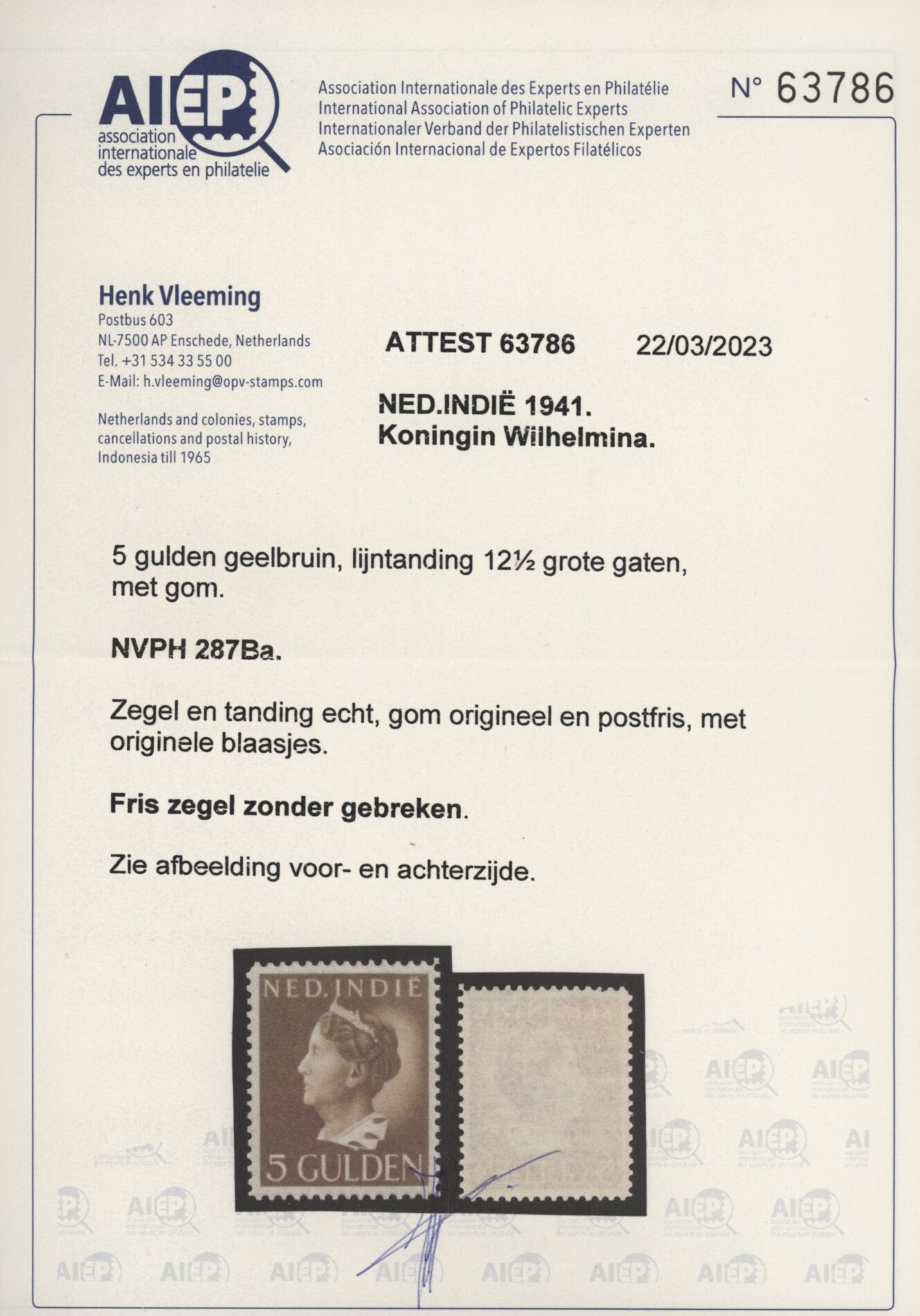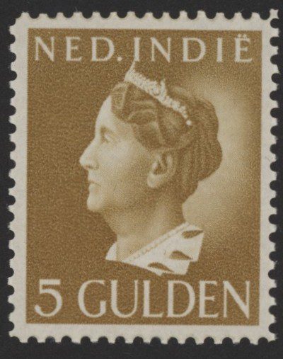 Nederlands Indië 1941, 5 gulden geelbruin, lijntanding 12½ grote gaten, NVPH nr. 287Ba (Koningin Wilhelmina) postfris met originele gom. Een fris zegel zonder gebreken met attest Vleeming