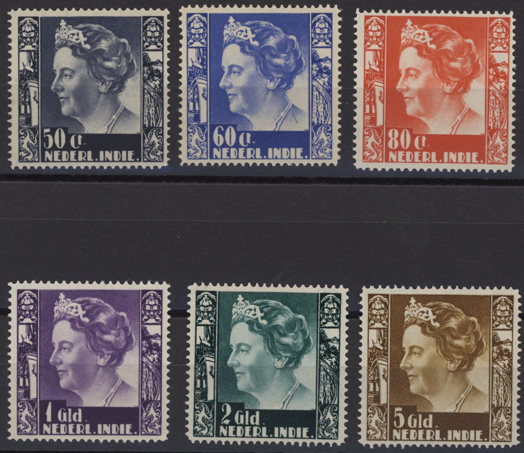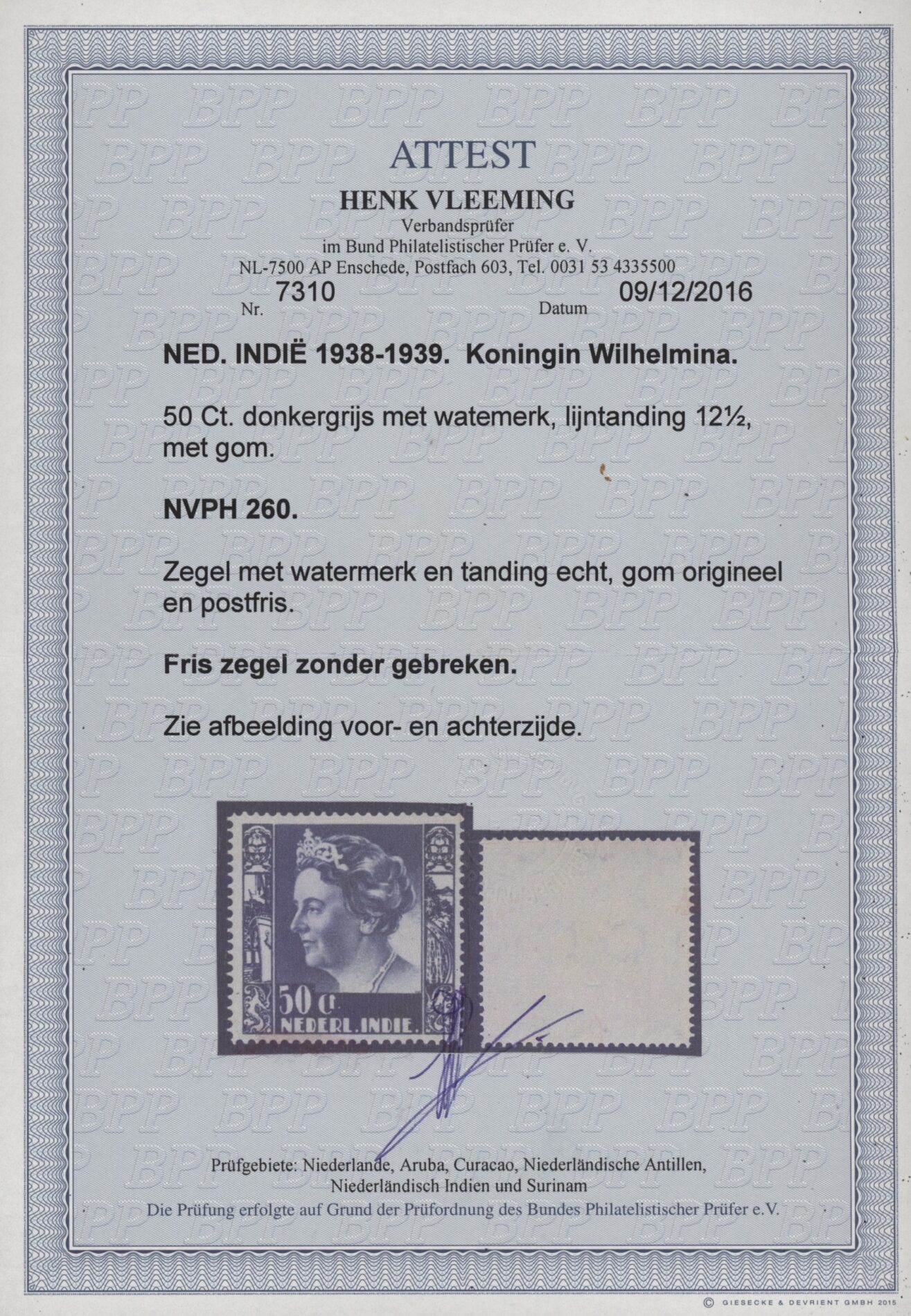Nederlands Indië 1938-1939, 50 cent donkergrijs tot en met 5 gulden geelbruin, lijntanding 12½, NVPH nrs 260-265 (Koningin Wilhelmina, groter formaat), postfris met originele gom. Een complete frisse serie zonder gebreken met Vleeming certificaat voor NVPH nr. 260.