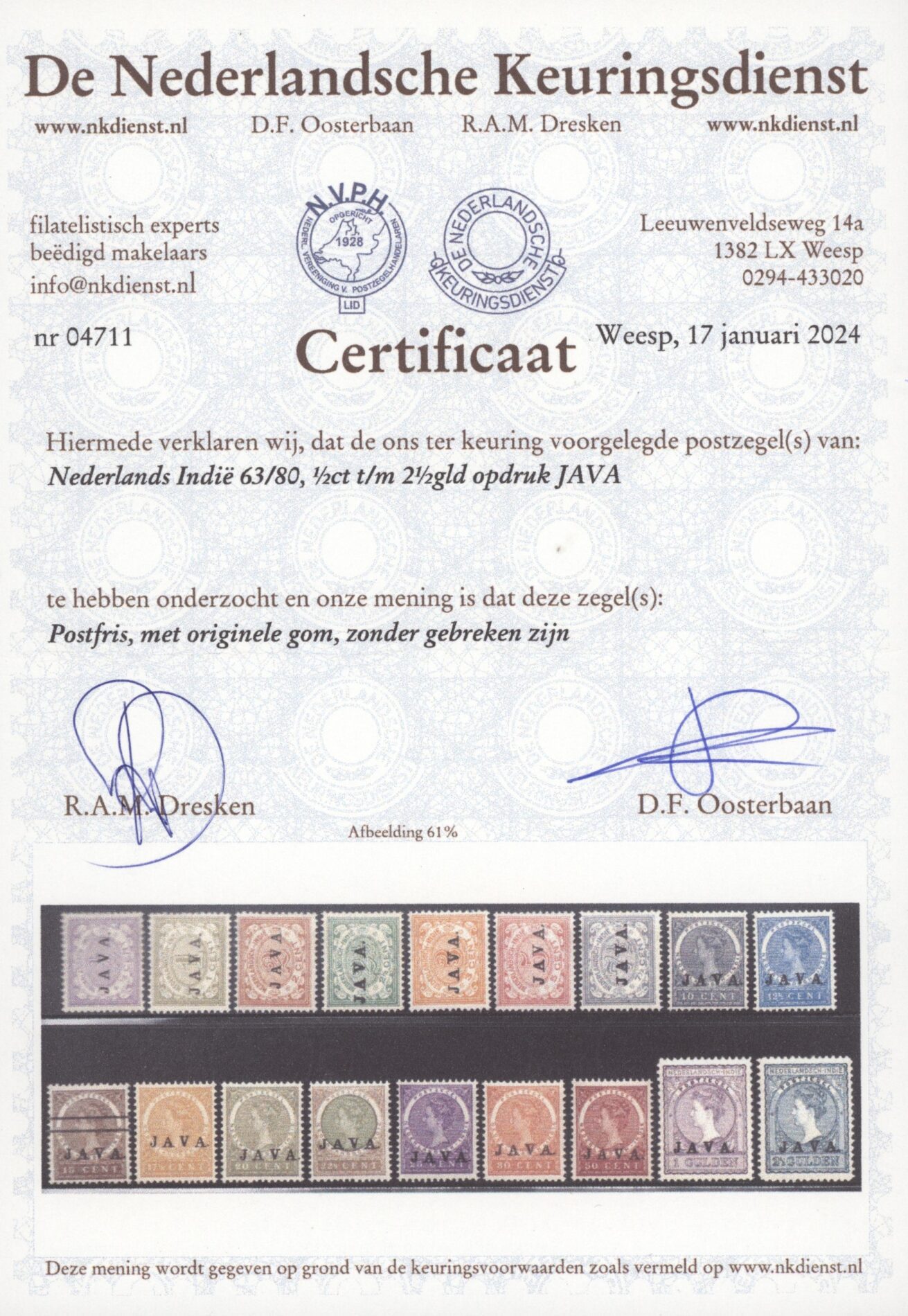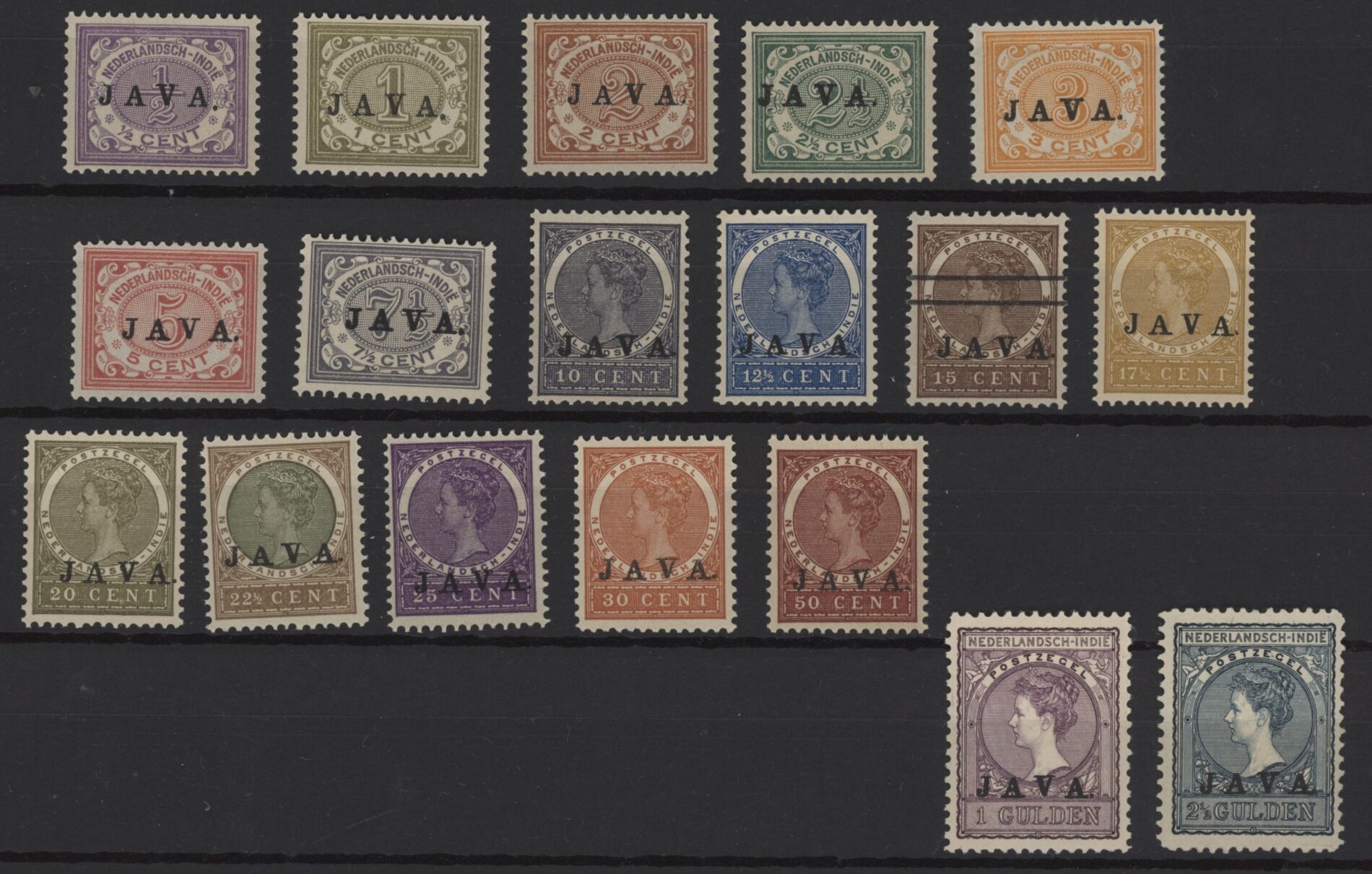 Nederlands Indië 1908, 2 cent bruin tot en met 2 gulden 50 cent oranjebruin en lichtblauw, NVPH nrs. 63-80 (Zegels der uitgiften 1902 / 3-1908 overdrukt in zwart met JAVA) postfris met originele gom. Een complete serie met frisse zegels zonder gebreken met NKD certificaat.
