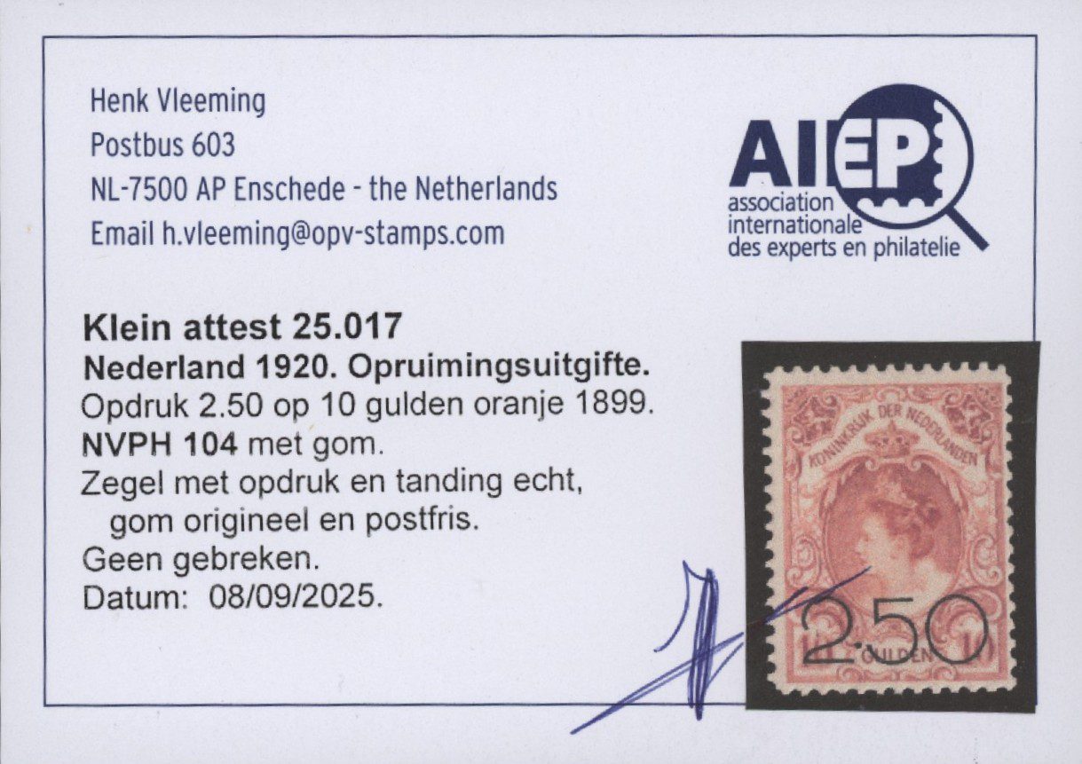 Nederland 1920, opdruk 2.50 op 10 gulden oranje 1905, lijntanding 11, NVPH nr. 104 (Opruimingsuitgifte) postfris met originele gom. Een fris zegel zonder gebreken met attest Vleeming.