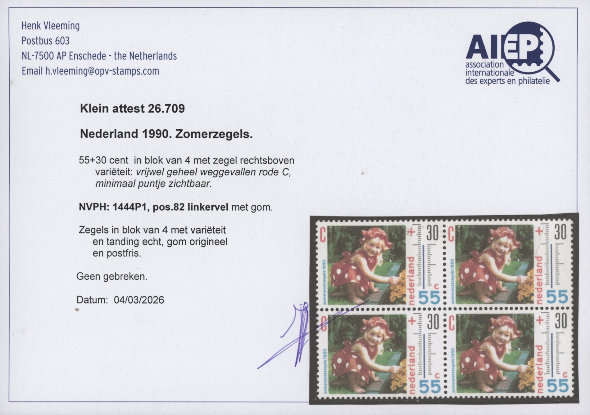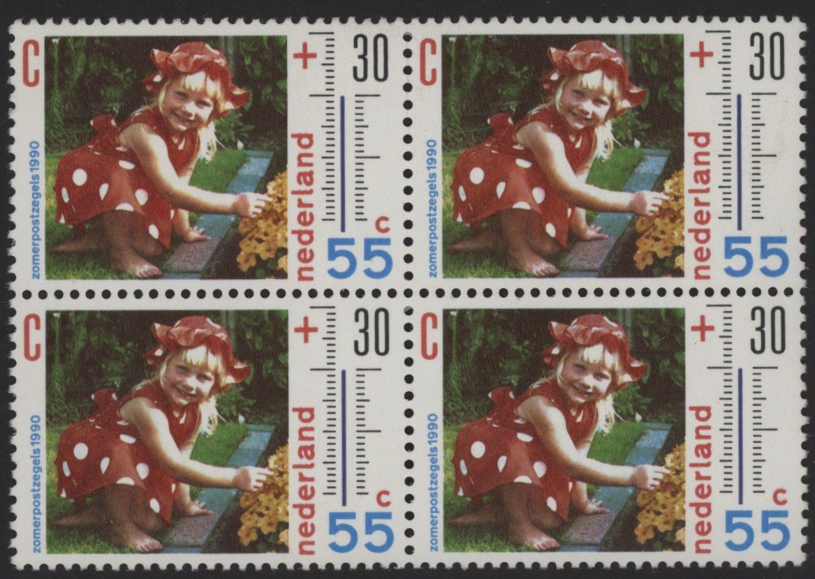 Nederland frankeerzegel 1990, 55 + 30 cent in blok van vier met zegel rechtsboven variëteit vrijwel geheel weggevallen rode C, NVPH nr. 1444P1 (zomerzegels) postfris met originele gom. Een fris blokje zonder gebreken met attest Vleeming.