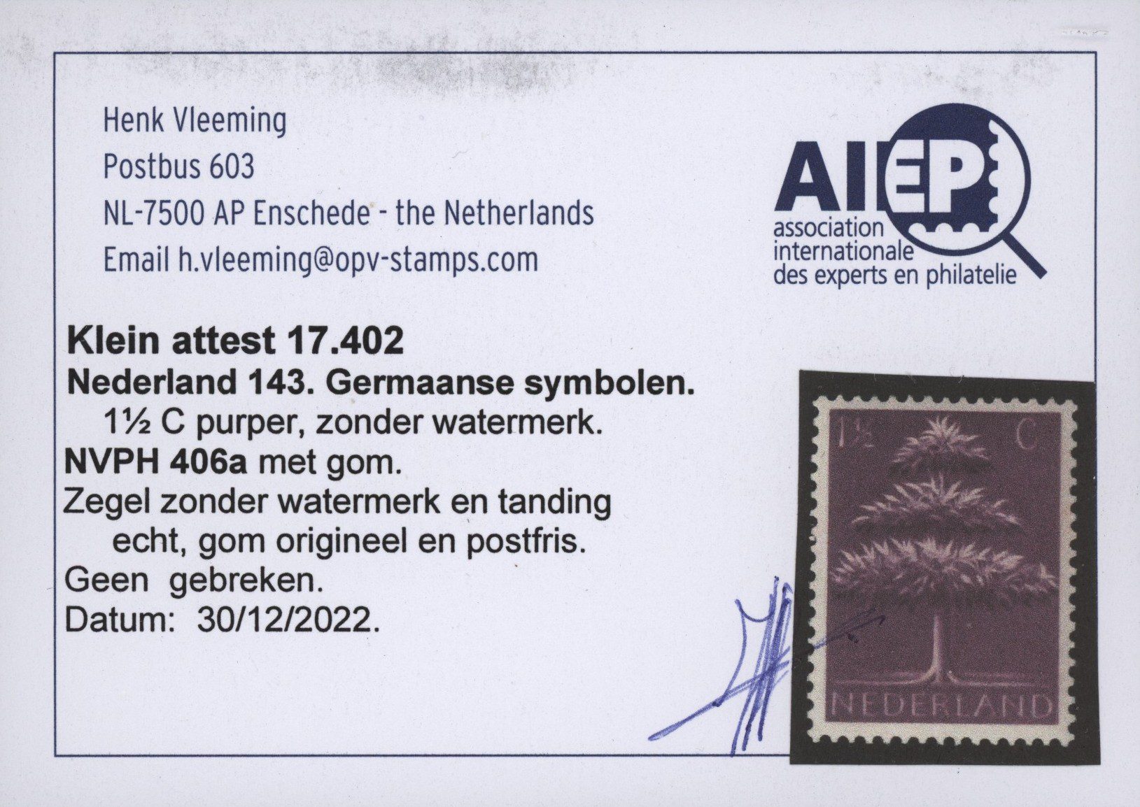 Nederland 1943, 1½ cent purper zonder watermerk, kamtanding 12: 12½, NVPH nr. 406a (Germaanse symbolen) postfris met originele gom. Een fris zegel zonder gebreken met attest Vleeming.