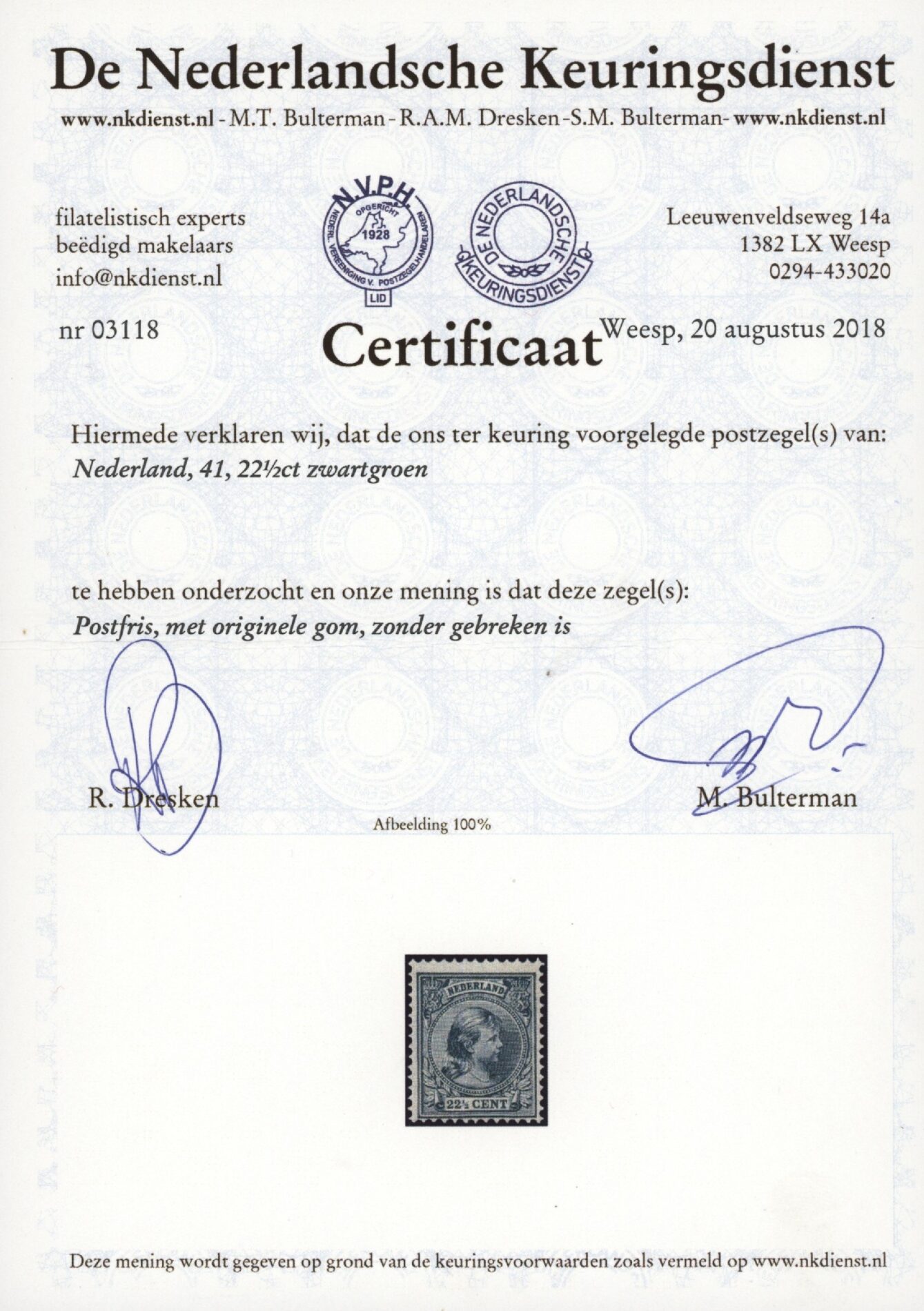 Frankeerzegels Nederland NVPH nr 41d postfris met certificaat NKD