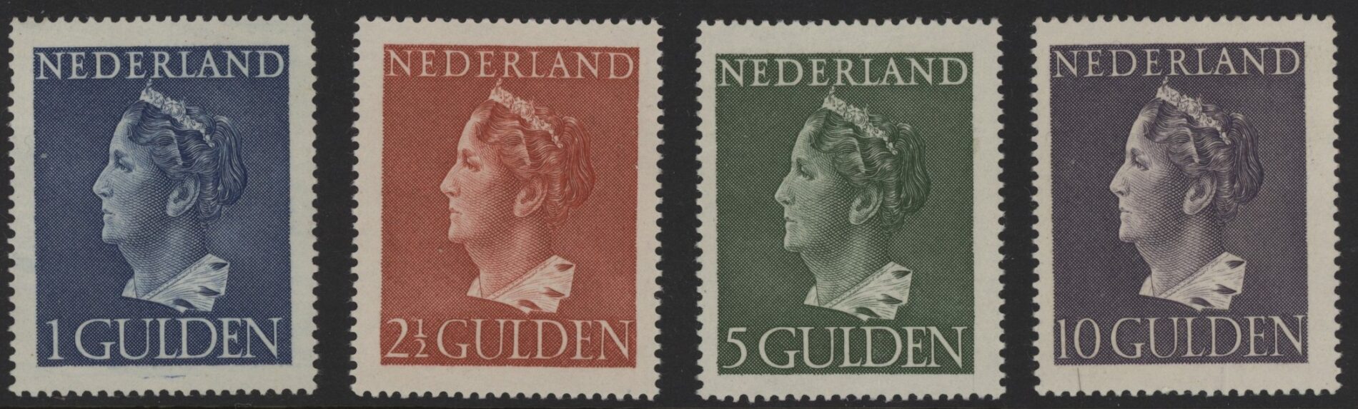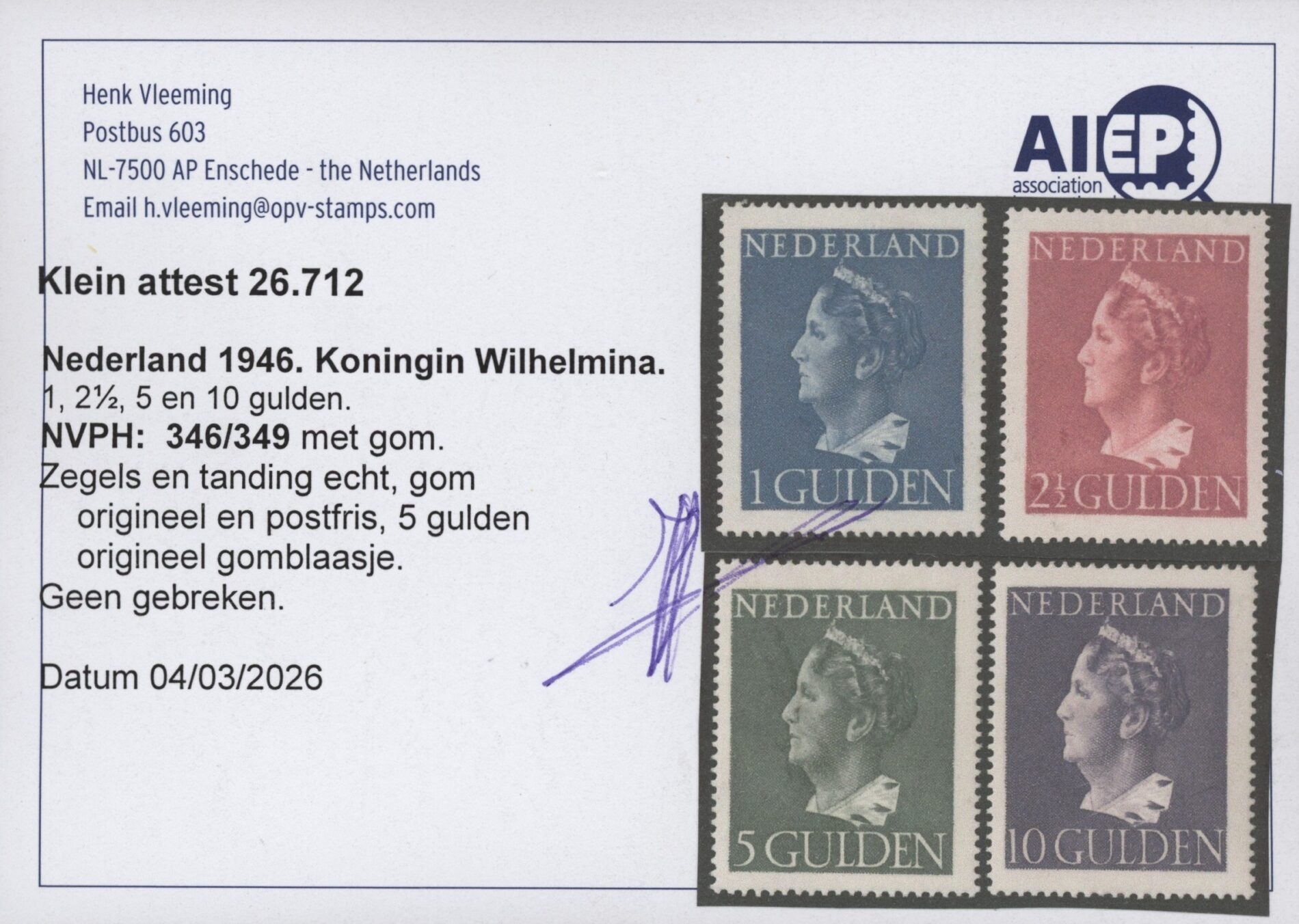 Frankeerzegels Nederland 1946, 1 gulden grijsblauw tot en met 10 gulden paars, kamtanding 13¼:14, NVPH nrs 346-349 (Koningin Wilhelmina “Konijnenburg”) postfris met originele gom. De complete serie met frisse zegels zonder gebreken met Vleeming attest.