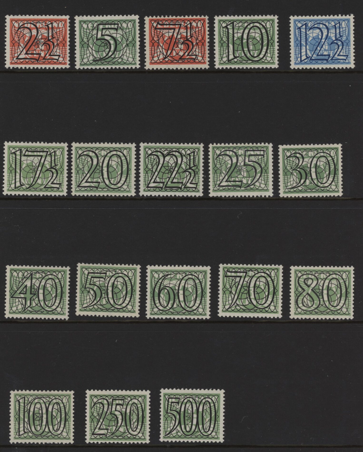 Nederland 1940, 2½ cent steenrood tot en met 500 cent geelgroen, kamtanding 12¾:13½, NVPH nrs. 356-373 (Guilloche of Traliezegels) postfris met originele gom. De complete serie met frisse zegels zonder gebreken.