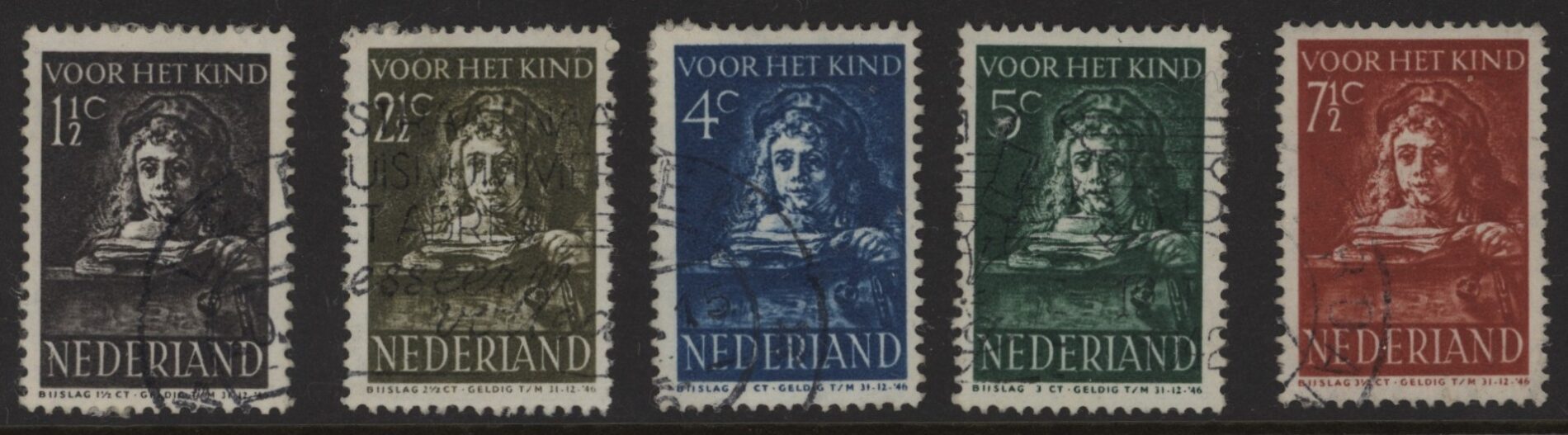 Nederland 1941, 1½+1½ cent bruingrijs tot en met 7½+3½ cent roodbruin, kamtanding 14¼ : 13¼, NVPH nrs. 397-401 (Kinderzegels) gestempeld. De complete serie met frisse zegels zonder gebreken.