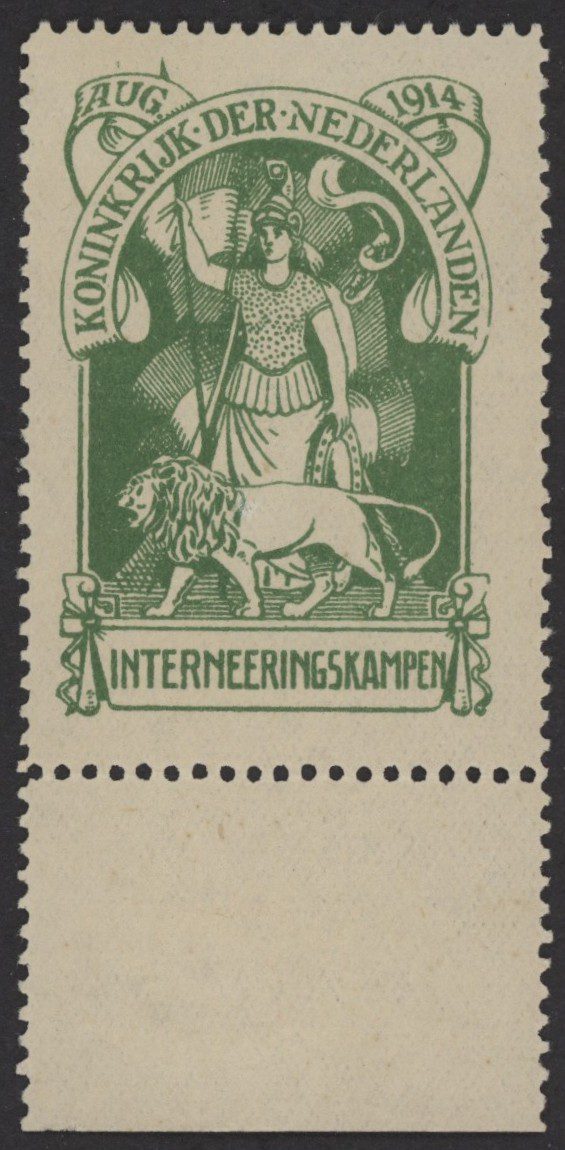 Internering 1916, groen zegel, lijntanding 11½ , met gom met variëteit breukjes in lijn boven 3e N in Nederlanden en rechts in strik, NVPH nr. IN1 met originele gom en postfris. Een fris zegel zonder gebreken met attest Vleeming.