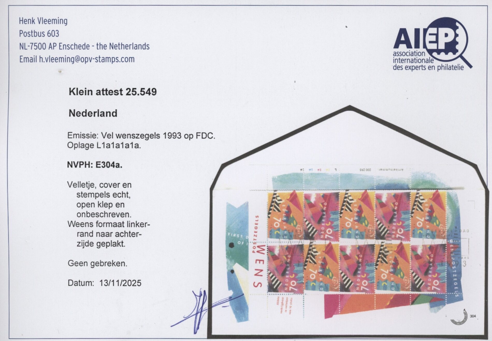 FDC Nederland NVPH nr. E304a (emissie Wenszegels met oplage L1a1a1a1a, 1993) met open klep en onbeschreven. Een fris cover zonder gebreken en met attest Vleeming.