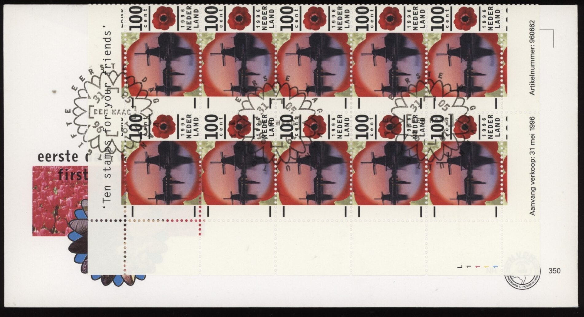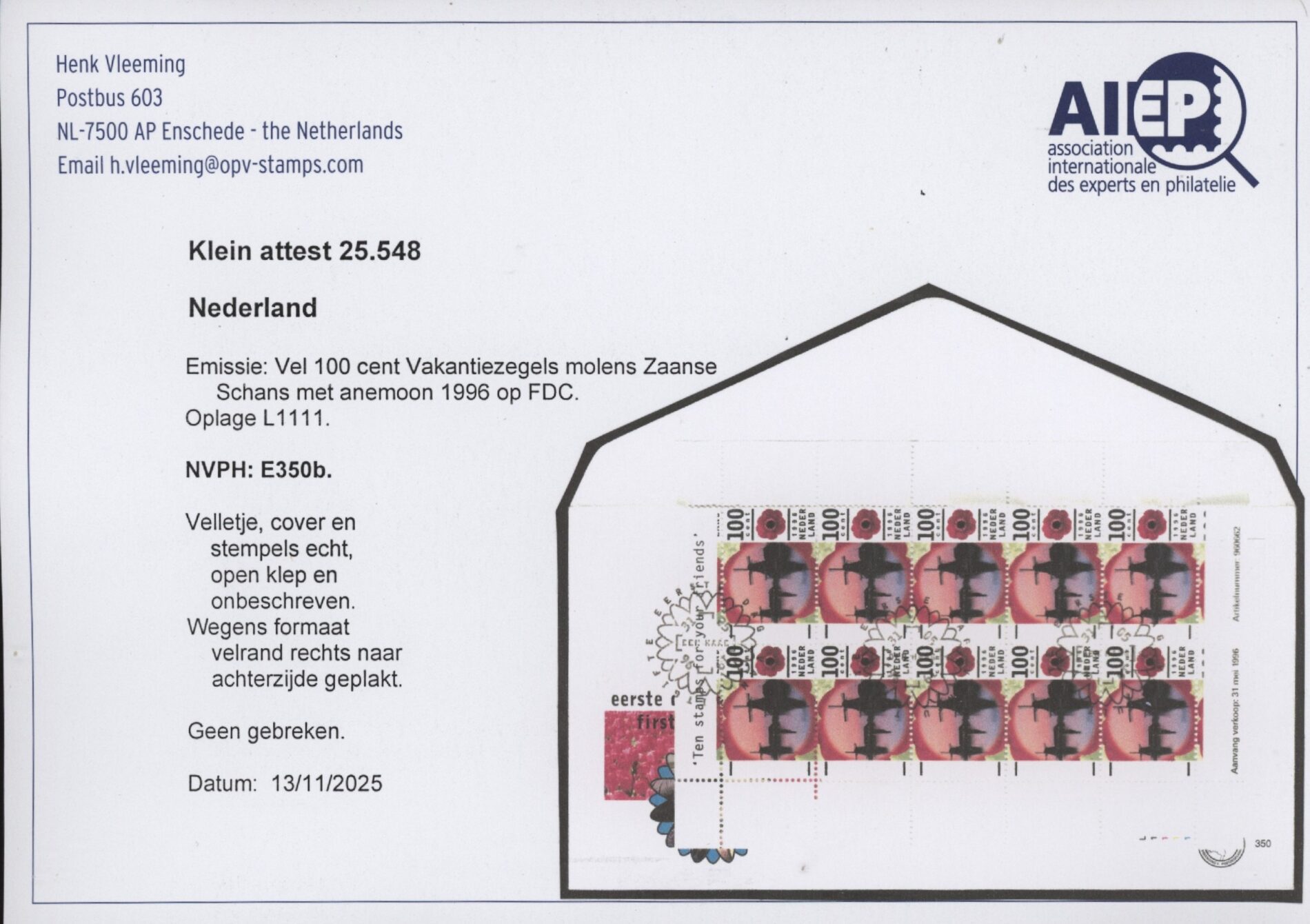 FDC Nederland NVPH nr. E350b (emissie Vakantiezegels molens Zaanse Schans met anemoon, oplage L1111, 1996) met open klep en onbeschreven. Een fris cover zonder gebreken en met attest Vleeming.
