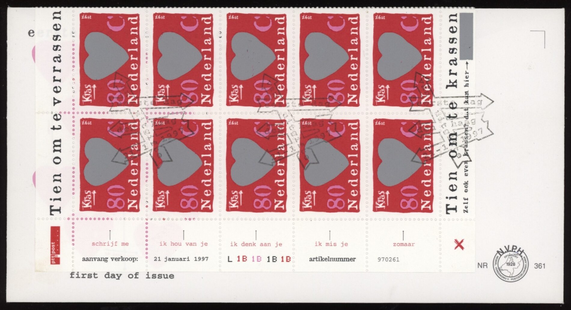 FDC Nederland NVPH nr. E361a (emissie Verrassingszegels met oplage L1B1B1B1B, 1997) met open klep en onbeschreven. Een fris cover zonder gebreken en met attest Vleeming.