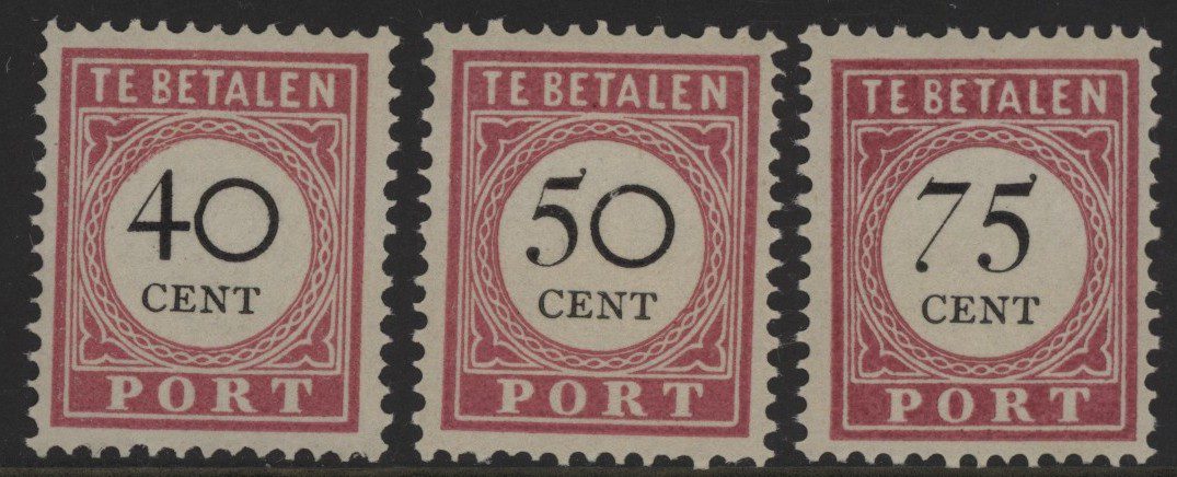 Nederland-Indië Portzegels 1941, 40 cent karmijn tot en met 75 cent karmijn, type I en kamtanding 12½, NVPH nrs. P20-P22 (cijfer en waarde in zwart) postfris met originele gom. Frisse zegels zonder gebreken met 5o cent met onder rechts stomp tandje met attest Vleeming.