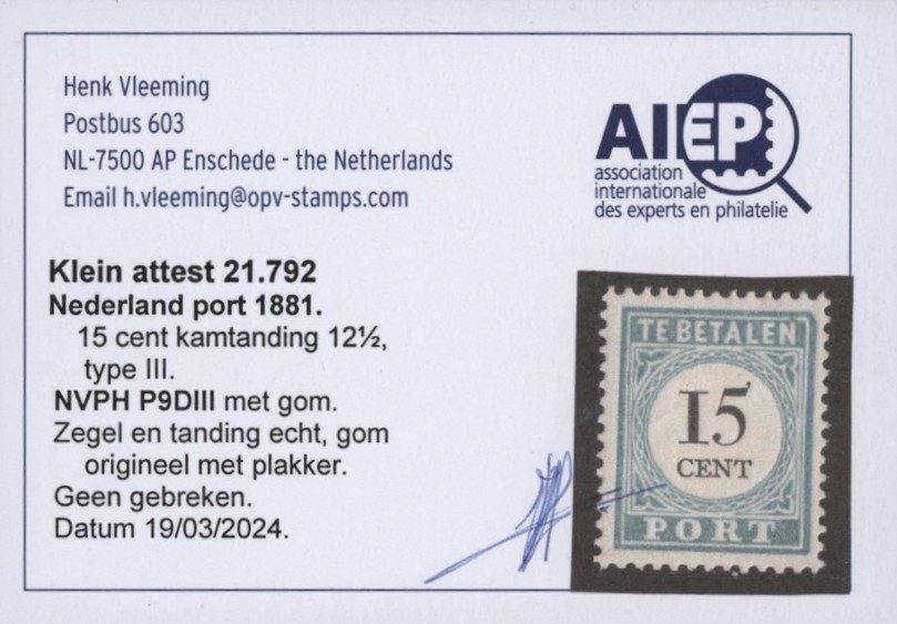 Portzegels Nederland NVPH nr. P9DIII ongebruikt met Vleeming attest